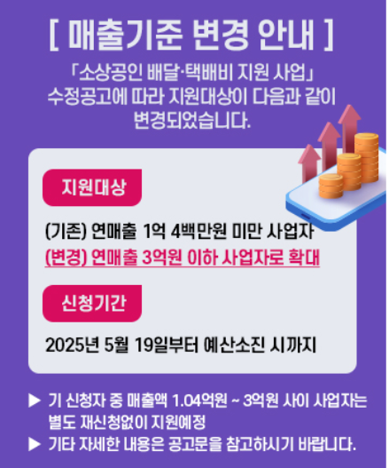 2025년 기준, 지원 대상은 기존 연매출 1억 400만 원 이하에서 3억 원 이하로 상향되었습니다.